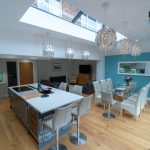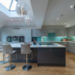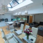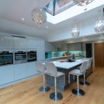 The extension formed the centrepiece of the renovation, opening up the rear of the property into a bright and spacious open-plan kitchen, dining, and living area. Large, five-metre bi-folding doors create a seamless connection to the garden, while a raised skylight ensures natural light pours into the heart of the home throughout the day. The kitchen was elevated with top-of-the-range appliances, including a bespoke extractor fan that combines style with functionality.