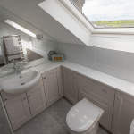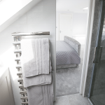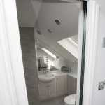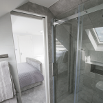 A clever design detail was the installation of a sliding pocket door at the entrance to the loft bathroom. Hidden within the wall when open, this feature eliminates the need for a hinged door, further maximising usable floor space. Inside the bathroom, a full-height tiled shower enclosure creates a luxurious ‘wet room’ feel, adding a sense of boutique hotel quality to the home.