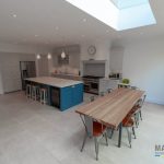 Inside, the new extension delivers a spacious kitchen and dining area filled with natural light thanks to a large skylight and wide sliding doors that open directly onto the garden. A striking feature island provides both a practical workspace and a central gathering point for the family, blending style with everyday functionality.